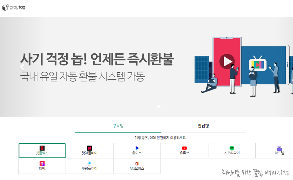 넷플릭스부터 왓챠, 웨이브까지. 계정 공유 사기 걱정 끝! '원하는 기간만 안전하게' 언제든 환불 가능한 그레이태그에서 만나보세요. > 그레이태그